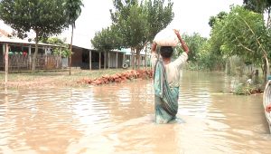 কাগজ প্রতিবেদক ॥ তখন দুপুর সাড়ে ১২টা। দৌলতপুর উপজেলার চিলমারি ইউনিয়নের চরচিলমারি বাজার। করগেট টিন দিয়ে নির্মিত প্রায় শতাধিক দোকানের বাজার। বুক সমান পানি পুরো বাজার জুড়ে। গায়ের কাপড় ভেজা মাথায় একটা টোপলা। বাজারের পাশেই বাড়ীর বাসিন্দা মেহেরজান। বয়স প্রায় ৭০। বছর খানিক আগে স্বামী বিয়োগ হয়েছে। নিজের জমি নেই, থাকবার জায়গা নেই। পরের জায়গায় ঘর করে বাস করে। একটা মেয়ে আছে। ঘরে পানি, বাইরে পানি। চৌকির উপর পানি। টিন, কাগজ পেতে ঘুমায়। ৩ আগষ্ট রাতে তখন মেয়ে নিয়ে ঘুমিয়ে ছিল। হটাৎ পানি এসে ঘর ভরে যায়। ভাসিয়ে নিয়ে গেছে বেশ কিছু থালাবাসন ও ঘরের আসবাব পত্র। এখন দিনে একবার কোন মতে খাবার জোটে। তাও পরের কাছে হাত পেতে। কথা হয় তার সাথে। মাথায় টোপলা নিয়ে ক্ষোভের সাথে বলে উঠলো মেহেরজান, আর কি কবো, চুলার উপর পানি উইঠ্যা দোর পারতাছে, একটা বিটি কেউ কিছু দেয় না, আইজ তিনদিন মুখে কিছু জোটে না। মাথার দিকে ইশারা করে জানায়, এই যে চাল নিছি এহন যায়া রান্না করুম,। মেহেরজানের মত চিলমারি ইউনিয়নের চরচিলমারি, বাংলাবাজারসহ ২০ গ্রামের মানুষের অবস্থা। আবেদের ঘাট থেকে ট্রলার থেকে দু পাশে যতদুর চোখ যায় শুধু পানি পানি আর পানি। পানিতে তলিয়ে গেছে শত শত ঘর বাড়ি। আউশ, আমন ধান, কলা, পাট, ভুট্রাসহ নানা ফসলের আগা উকি দিয়ে আছে। বাশেঁর ঝাড়, কলাবাগানে পচন ধরেছে। বৈদ্যুতিক খুটি হেলে পড়েছে। বেশির ভাগ গ্রামেই বিদ্যুত নেই। আবেদের ঘাট থেকে ভাগজোত পর্যন্ত মাটির রাস্তাটি অর্ধেকের বেশি ডুবে গেছে। চিলমারি বাজারে যেতে বসবাসের জন্য করগেট টিন দিয়ে নির্মিত বেশির ভাগ বাড়ী বুক সমান পানির নিচে। মাঝে মধ্যে দুএকটি বাড়ীতে মানুষ আছে যাদের যাওয়ার কোন জায়গা নেই। উচু এবং শহরে এলাকায় যাদের আত্মীয় আছে সেখানে আশ্রয় নিয়েছে বাকিরা। পানির মধ্যে কোথাও কোথাও টিউবওয়েল নজরে পড়লো। শুধু মাথাটা দেখা যাচ্ছে। একখানা ১০ ফিটের করগেট টিন আর দুপাশে দুটি কাঠের বাটাম দিয়ে বন্যার্তরা তৈরি করেছে ডিঙ্গি নৌকা। পদ্মা থেকে ছেয়ে আসা পানিতে ওই ডিঙ্গিতেই ধরছে মাছ। আত্মীয় স্বজনের বাড়ী, বাজার, ঘাটে যাতায়াতের জন্য ব্যবহারও করছে সেটা। ছোট্র একটি লাঠির মত হাল দিয়ে বেশির ভাগ যুবক, শিশু, কিশোর এমনকি মহিলারাও যাতায়াত করছে ডিঙ্গিতে। কথা হয় এলাকার পশু চিকিৎসক ডাঃ ফজলুল হকের সাথে। তিনি জানান, পশুর সাথে তিনি মানুষের চিকিৎসাও করছেন। জ¦র-সর্দি, কাশিসহ পানিবাহি নানা রোগাক্রান্ত মানুষের চিকিৎসা দিচ্ছেন তিনি। এলাকার বর্ণাণা দিতে যেয়ে তিনি বলেন, আজ ২৫ দিন চিলমারি,রামকৃষ্ণপুর ইউনিয়নের ৪০ গ্রাম পানিতে আবদ্ধ। এখানকার ১৫টি গ্রামে তার চলাচল। এলাকায় একটি বাড়ীও খুঁজে পাওয়া যাবে না যেখানে পানি উঠেনি। শো