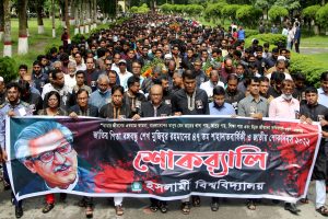 কাগজ প্রতিবেদক ॥ ইসলামী বিশ্ববিদ্যালয়ের ভাইস চ্যান্সেলর প্রফেসর ড. শেখ আবদুস সালাম বলেছেন, জাতির পিতা বঙ্গবন্ধু শেখ মুজিবুর রহমানকে স্মরণের মধ্যদিয়ে শক্তি এবং সাহস যোগাতে হবে। বঙ্গবন্ধু বাঙালি জাতির আদর্শ, তিনি আমাদের অনুপ্রেরণা। তিনি বলেন, ঘাতকেরা মাত্র ৫৫ বছরের জীবনে বঙ্গবন্ধুকে আমাদের মাঝ থেকে কেড়ে নিয়ে দেশকে ৪৭ বছর পিছিয়ে দিয়েছে। ভিসি বলেন, বঙ্গবন্ধু তাঁর সাড়ে ৩ বছরের শাসনামলে দেশের প্রতিটি উন্নয়নে স্পর্শ করেছিলেন। তিনি বলেন, আসুন আমরা প্রধানমন্ত্রী জননেত্রী শেখ হাসিনার নেতৃত্বে যার যার অবস্থান থেকে বঙ্গবন্ধুর স্বপ্নের সোনার বাংলা গড়ার অসমাপ্ত কাজ সমাপ্ত করি। ইসলামী বিশ্ববিদ্যালয়ের আয়োজনে জাতির পিতা বঙ্গবন্ধু শেখ মুজিবুর রহমানের ৪৭তম শাহাদাতবার্ষিকী ও ১৫ আগস্ট জাতীয় শোকদিবস ২০২২ উপলক্ষে মৃত্যুঞ্জয়ী মুজিব ম্যুরালে শ্রদ্ধাঞ্জলি নিবেদন শেষে ভাইস চ্যান্সেলর ড. শেখ আবদুস সালাম এসব কথা বলেন। এদিকে দিনটি যথাযোগ্য মর্যাদায় পালনের লক্ষ্যে বিশ^বিদ্যালয়ের পক্ষ থেকে বিভিন্ন কর্মসূচি গ্রহন করা হয়। কর্মসূচি অনুযায়ী ১৪ আগস্ট রাতে জাতির পিতা বঙ্গবন্ধু শেখ মুজিবুর রহমানসহ ১৫ আগস্টের সকল শহিদের আত্মার মাগফিরাত কামনায় কেন্দ্রীয় মসজিদে পবিত্র কুরআন খতম করা হয়। ১৫ আগস্ট সকাল সাড়ে ৯ টায় প্রশাসন ভবন চত্বরে জাতীয় পতাকা উত্তোলন করে অর্ধনমিত করেন ভাইস চ্যান্সেলর প্রফেসর ড. শেখ আবদুস সালাম এবং কালো পতাকা উত্তোলন করেন প্রো-ভাইস চ্যান্সেলর প্রফেসর ড. মোঃ মাহবুবুর রহমান। এসময় তাঁদের সাথে ছিলেন ট্রেজারার প্রফেসর ড. মোঃ আলমগীর হোসেন ভূঁইয়া ও রেজিস্ট্রার (ভার:) এইচ. এম. আলী হাসান। একই সময়ে অনুরূপভাবে হলসমূহে পতাকা উত্তোলন করেন স্ব-স্ব হলের প্রভোস্টগণ। পতাকা উত্তোলন শেষে ১ মিনিট নিরবতা পালন করা হয়। সকাল ৯.৪৫ মিনিটে প্রশাসন ভবন চত্বর হতে এক শোকর‌্যালি বের করা হয়। র‌্যালিটি ক্যাম্পাসের প্রধান প্রধান সড়ক প্রদক্ষিণ করে মৃত্যুঞ্জয়ী মুজিব ম্যুরালে শেষ হয়। সকাল ১০ টায় মৃত্যুঞ্জয়ী মুজিব ম্যুরালে বিশ্ববিদ্যালয়ের পক্ষ থেকে শ্রদ্ধাঞ্জলি নিবেদন করেন ভাইস চ্যান্সেলর প্রফেসর ড. শেখ আবদুস সালাম। এসময় প্রো-ভাইস চ্যান্সেলর, ট্রেজারার ও রেজিস্ট্রার (ভার:) উপস্থিত ছিলেন। ভাইস চ্যান্সেলরের শ্রদ্ধাঞ্জলি নিবেদন শেষে শিক্ষক সমিতিসহ বিভিন্ন সমিতি, বঙ্গবন্ধু পরিষদসহ বিভিন্ন পরিষদ, বিভিন্ন ফোরাম, বিভিন্ন অনুষদ, হল, বিভাগ, বাংলাদেশ ছাত্রলীগসহ বিভিন্ন ছাত্র সংগঠন এবং বিভিন্ন সামাজিক ও সাংস্কৃতিক সংগঠন শ্রদ্ধাঞ্জলি নিবেদন করে। শ্রদ্ধাঞ্জলি নিবেদন শেষে সেখানে বক্তব্য রাখেন ভাইস চ্যান্সেলর প্রফেসর ড. শেখ আবদুস সালাম। এরপর জাতি