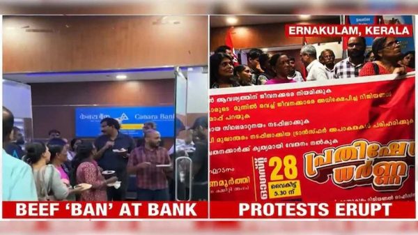এনএনবি : ভারতের কেরালা রাজ্যের কোচিতে কানাড়া ব্যাংকের রিজিওনাল ম্যানেজার ব্যাংকের ক্যান্টিনে গরুর মাংস নিষিদ্ধ করার পর কর্মীরা ওই সিদ্ধান্তের এক অনন্য প্রতিবাদ জানিয়েছেন। তারা ব্যাংকের শাখার সামনে ‘বিফ পার্টি’