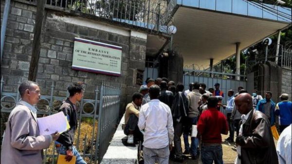 ইথিওপিয়ার রাজধানী আদ্দিস আবাবায় রুশ দূতাবাসের সামনে প্রতিদিন সকালে তৈরি হচ্ছে দীর্ঘ লাইন। সামাজিক যোগাযোগমাধ্যমে ছড়িয়ে পড়া গুজব অনুসরণ করে তরুণ পুরুষ ও বয়স্করা ইউক্রেনে রাশিয়ার হয়ে যুদ্ধে যেতে লাইনে
