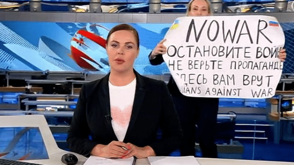 রাশিয়ার সরকারি টিভি চ্যানেল ‘চ্যানেল ওয়ান’-এ স্থানীয় সময় গত সোমবার সন্ধ্যায় খবর পড়ছিলেন এক নারী। এ সময় সেখানে যুদ্ধবিরোধী প্ল্যাকার্ড হাতে উপস্থিত হন আরেক নারী। খবর বিবিসির। সংবাদ উপস্থাপকের পেছনে