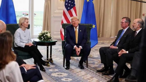 এনএনবি : কয়েক সপ্তাহের নিবিড় আলোচনার পর অবশেষে বাণিজ্য চুক্তিতে পৌঁছেছেন ইউরোপীয় ইউনিয়ন (ইইউ) ও যুক্তরাষ্ট্রের শীর্ষ বাণিজ্য কর্মকর্তারা। চুক্তি অনুযায়ী, যুক্তরাষ্ট্রে ইউরোপীয় ইউনিয়নের সব রপ্তানি পণ্যের ওপর শুল্ক থাকবে