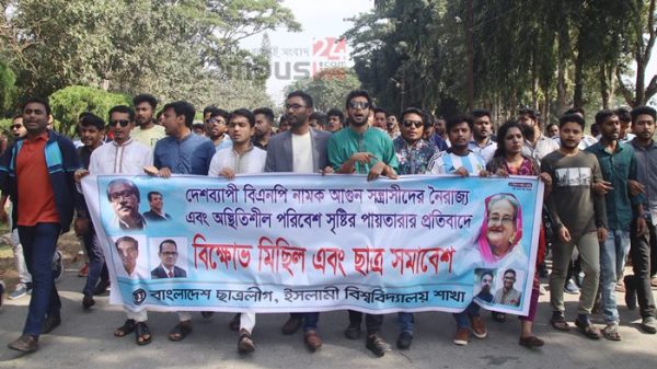 কাগজ প্রতিবেদক ॥ দেশজুড়ে বিএনপি-জামায়াতের অরাজকতা, নৈরাজ্য, অগ্নিসন্ত্রাস ও বোমাবাজির প্রতিবাদে ইসলামী বিশ্ববিদ্যালয়ে (ইবি) বিক্ষোভ মিছিল ও ছাত্র সমাবেশ করেছে শাখা ছাত্রলীগ। শনিবার (১০ ডিসেম্বর) দুপুর সাড়ে ১২টার দিকে দলীয়
