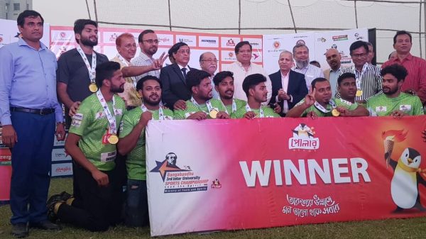 কাগজ প্রতিবেদক ॥ বঙ্গবন্ধু আন্তঃবিশ্ববিদ্যালয় স্পোর্টস চ্যাম্পিয়নশিপ এর তৃতীয় আসরে হ্যান্ডবল ফাইনালে ঢাকা বিশ্ববিদ্যালয়কে ৩১-২২ গোলে পরাজিত করে ইসলামী বিশ্ববিদ্যালয় চ্যাম্পিয়ন হয়েছে। চ্যাম্পিয়ন দলের ইমন সেরা খেলোয়াড় নির্বাচিত হয়েছেন। গতকাল