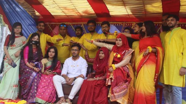 কাগজ প্রতিবেদক ॥ ইসলামী বিশ্ববিদ্যালয় (ইবি) ক্যাম্পাসে এক ছাত্রের গায়ে হলুদের অনুষ্ঠান করেছেন শিক্ষার্থীরা। সোমবার (৭ নভেম্বর) ক্যাম্পাস জিমনেসিয়ামের সামনে ফলিত রসায়ন ও কেমিকৌশল বিভাগের ২০১৬-১৭ শিক্ষাবর্ষের শিক্ষার্থী রাকিবুল ইসলাম