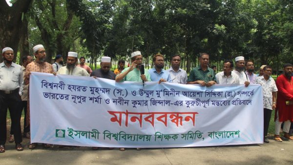 কাগজ প্রতিবেদক ॥ ভারতের ক্ষমতাসীন দল বিজেপির দুই নেতা কর্তৃক মহানবী হযরত মুহাম্মদ (সা.) ও তার স্ত্রী আয়েশা (রা.) কে কটূক্তির প্রতিবাদে মানববন্ধন করেছেন ইসলামী বিশ^বিদ্যালয়ের শিক্ষকরা। মঙ্গলবার (১৪ জুন)