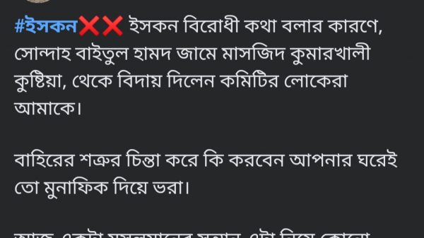 কাগজ প্রতিবেদক ॥ কুমারখালীতে সোন্দাহ বাইতুল হামদ জামে মসজিদের ইমাম মিনহাজ আল আদনান চাকুরি থেকে অব্যাহতির ঘটনায় সামাজিক মাধ্যম ফেসবুকে নানা রকম মন্তব্যের ঝড় ওঠে।এলাকাবাসী সূত্রে জানা যায় বিষয়টি নিয়ে