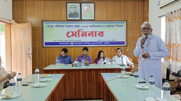 কুমারখালী প্রতিনিধি ॥ কুষ্টিয়ার কুমারখালীতে ভোক্তা অধিকার সংরক্ষণ আইন -২০০৯ অবহিতকরণ ও বাস্তবায়ন বিষয়ক সেমিনার অনুষ্ঠিত হয়েছে। গতকাল বুধবার সকাল সাড়ে ১০ টায় উপজেলা পরিষদ সভাকক্ষে এই অবহিতকরণ সভা অনুষ্ঠিত