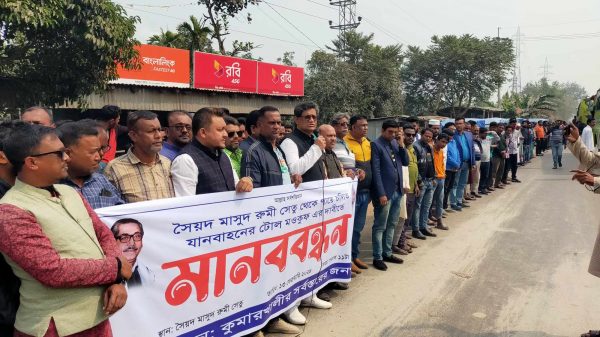 কাগজ প্রতিবেদক ॥ কুষ্টিয়ার কুমারখালীতে সৈয়দ মাসুদ রুমী সেতুতে ভ্যান, রিকশা, সাইকেলসহ পায়ে চালিত যানবাহনের টোল মওকুফের দাবিতে মানববন্ধন করা হয়েছে। কুমারখালীর সর্বস্তরের জনগণের ব্যানারে মঙ্গলবার সকালে গড়াই নদীর ওপর