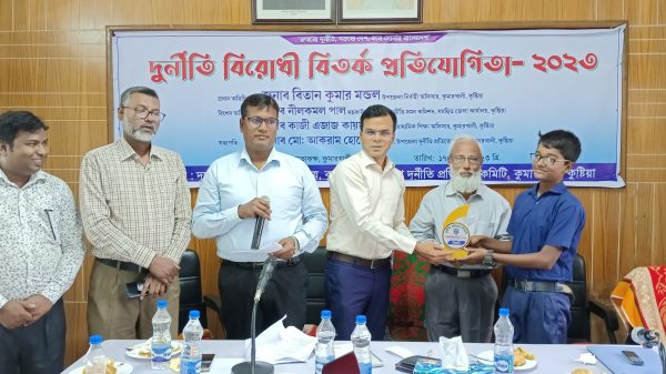 কুমারখালী প্রতিনিধি ॥ কুষ্টিয়ার কুমারখালীতে দুর্নীতি বিরোধী বিতর্ক প্রতিযোগিতা অনুষ্ঠিত হয়েছে। গতকাল সকাল ১০টায় উপজেলা পরিষদ সভাকক্ষে “প্রতিরোধ নয়, দমনই দুর্নীতি নির্মুলের কার্যকর উপায়” প্রতিপাদ্যে বিতর্ক প্রতিযোগিতা অনুষ্ঠিত হয়। দুর্নীতি