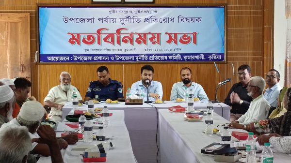 কুমারখালী প্রতিনিধি ॥ কুষ্টিয়ার কুমারখালীতে দুর্নীতি প্রতিরোধ বিষয়ক মতবিনিময় সভা অনুষ্ঠিত হয়েছে। গতকাল সোমবার বেলা ১১ টায় উপজেলা পরিষদ সভাকক্ষে মতবিনিময় সভা অনুষ্ঠিত হয়। উপজেলা দুর্নীতি প্রতিরোধ কমিটির সভাপতি আকরাম