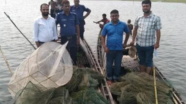 কাগজ প্রতিবেদক ॥ কুষ্টিয়ার কুমারখালী উপজেলায় পদ্মা নদীতে অভিযান চালিয়ে অবৈধ ৫০টি চায়না দুয়ারী ও ৫০০ মিটার কারেন্ট জাল জব্দ করা হয়েছে। পরে জব্দকৃত জাল আগুনে পুড়িয়ে বিনষ্ট করা হয়।