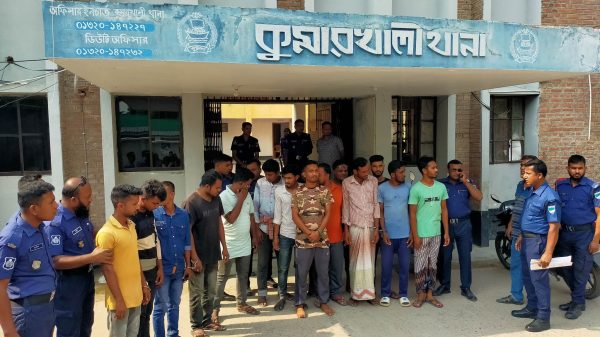 ১৪ জন গ্রেফতার ড্রাম ট্রাক ও লাটাহাম্বাসহ সাতটি গাড়ি জব্দ কুমারখালী প্রতিনিধি ॥ কুষ্টিয়ার কুমারখালী উপজেলায় গড়াই নদী থেকে অবৈধভাবে বালু উত্তোলনের অভিযোগে গ্রেফতার করেছে পুলিশ। শনিবার সকালে চাপড়া ইউনিয়নের