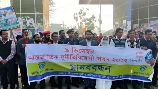 কুমারখালী প্রতিনিধি ॥ আন্তর্জাতিক দুর্নীতি বিরোধী দিবস উপলক্ষে কুষ্টিয়ার কুমারখালীতে জাতীয় সংগীত পরিবেশনের মাধ্যমে জাতীয় পতাকা উত্তোলন, বেলুন উড়ানো, মানববন্ধন ও আলোচনা সভা অনুষ্ঠিত হয়েছে। উপজেলা দুর্নীতি প্রতিরোধ কমিটির আয়োজনে