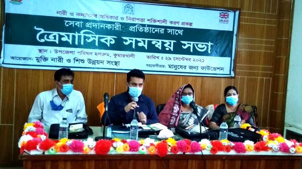 কুমারখালী প্রতিনিধি ॥ নারী ও কন্যাদের অধিকার ও নিরাপত্তা শক্তিশালী করণ প্রকল্পের আওতায় কুমারখালীতে সেবা প্রদানাকারী প্রতিষ্ঠানের সাথে ত্রৈমাসিক সমন্বয় সভা অনুষ্ঠিত হয়েছে। বুধবার দুপুরে উপজেলা পরিষদ সভাকক্ষে মানুষের জন্য