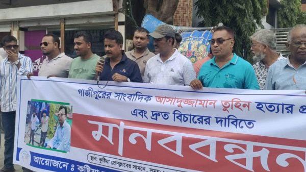 কাগজ প্রতিবেদক ॥ গাজীপুরের সাংবাদিক আসাদুজ্জামান তুহিন হত্যার প্রতিবাদে এবং হত্যাকারীদের দ্রুত গ্রেপ্তার ও দৃষ্টান্তমূলক শাস্তির দাবিতে কুষ্টিয়ায় মানববন্ধন কর্মসূচি পালন করেছে কুষ্টিয়া সাংবাদিক ইউনিয়ন -কেইউজে রেজিঃ নং- খুলনা: ২০৬৯।