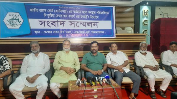 কুষ্টিয়া দি চেম্বার অব কমার্স এন্ড ইন্ডাষ্ট্রির সংবাদ সম্মেলন কাগজ প্রতিবেদক ॥ জাতীয় রাজস্ব বোর্ড (এনবিআর) এর বর্তমান অচল অবস্থার পরিপ্রেক্ষিতে দি কুষ্টিয়া চেম্বার অব কমার্স এন্ড ইন্ডাস্ট্রি’র উদ্যোগে আয়োজিত