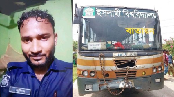 কাগজ প্রতিবেদক ॥ কুষ্টিয়ায় দায়িত্বপালন করা অবস্থায় ইসলামী বিশ্ববিদ্যালয়ের শিক্ষার্থী বহনকারী বাসের চাপায় পুলিশের এক সদস্য নিহত হয়েছেন। গতকাল শনিবার (২৮ জুন) সকাল সাড়ে ১০টায় সদর উপজেলার ভাদালিয়া এলাকায় অবস্থিত
