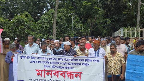 কাগজ প্রতিবেদক ॥ বাংলাদেশ পানি উন্নয়ন বোর্ড (বাপাউবো) কুষ্টিয়া শাখা-২ কর্তৃক কুমারখালি উপজেলার চাপড়া ইউনিয়নের বাধবাজার এলাকায় ৫৪ বছর ধরে গড়ে উঠা দোকানপাট ও বসতবাড়ি উচ্ছেদের নোটিশ প্রদান করায় তীব্র