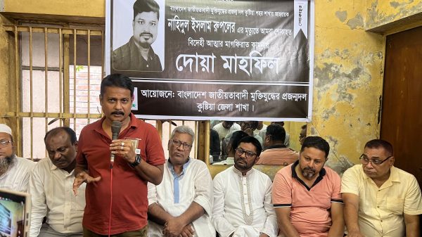 কাগজ প্রতিবেদক ॥ বাংলাদেশ জাতীয়তাবাদী মুক্তিযুদ্ধের প্রজন্ম দল কুষ্টিয়া শহর শাখার আহ্বায়ক নাহিদুল ইসলাম রুপল এর বিদেহী আত্মার মাগফিরাত কামনা করে দোয়া ও স্মরণসভা অনুষ্ঠিত হয়েছে। শনিবার দুপুরে বাংলাদেশ জাতীয়তাবাদী
