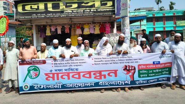 কাগজ প্রতিবেদক ॥ পাঁচ দফা দাবিতে কুষ্টিয়ায় ইসলামী আন্দোলনের উদ্যোগে মানববন্ধন অনুষ্ঠিত হয়েছে। বুধবার বেলা ১১টা হতে ইসলামী আন্দোলন বাংলাদেশের কেন্দ্রীয় কর্মসূচির অংশ হিসেবে কুষ্টিয়া প্রেসক্লাবের সামনে এ মানববন্ধন অনুষ্ঠিত