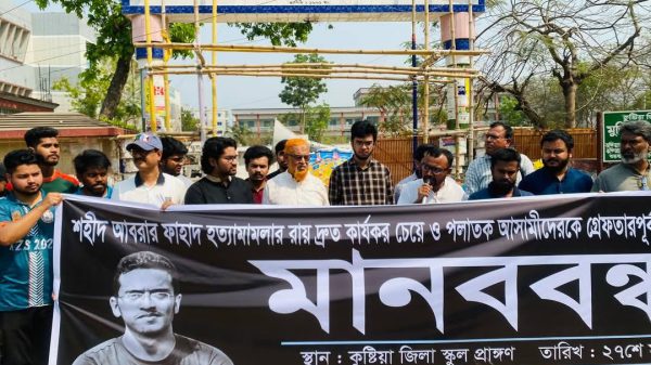 কাগজ প্রতিবেদক ॥ বাংলাদেশ প্রকৌশল বিশ্ববিদ্যালয়ের (বুয়েট) শিক্ষার্থী আবরার ফাহাদের পলাতক খুনিদের গ্রেপ্তার ও রায় দ্রুত কার্যকরের দাবি জানানো হয়েছে। আবরারের প্রাক্তন প্রতিষ্ঠান কুষ্টিয়া জিলা স্কুলের সামনে আজ বৃহস্পতিবার দুপুরে