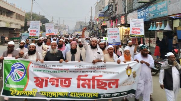 কাগজ প্রতিবেদক ॥ কুষ্টিয়ায় রমজানের পবিত্রতা রক্ষায় কুষ্টিয়া ইসলামী আন্দোলনের উদ্যোগে স্বাগত বর্ণাঢ্য র্যালী বের করা হয়। বৃহস্পতীবার বাদ আছর র্যালীটি কুষ্টিয়া বড় বাজার জামে মসজিদ থেকে শুরু হয়ে শহরের