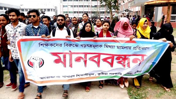 কাগজ প্রতিবেদক ॥ কুষ্টিয়া সরকারী কলেজের ১৩শিক্ষকের বিরুদ্ধে ৫ আগষ্টে হত্যা চেষ্টার অভিযোগে করা ষড়ড়যন্ত্র ও হয়রানি মূলক মামলার প্রতিবাদ এবং নি:শর্তে এই মামলা প্রত্যাহার দাবিতে বিক্ষোভ মিছিল, মানব বন্ধন