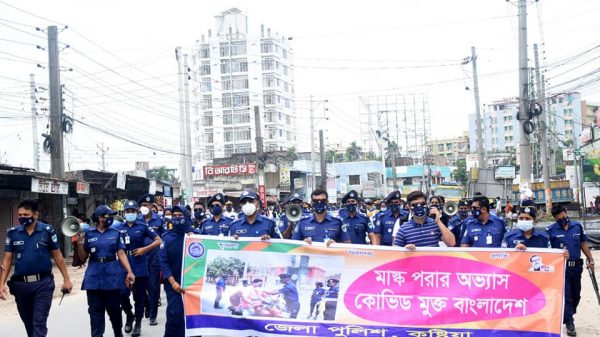 কাগজ প্রতিবেদক ॥ “মাস্ক পরার অভ্যেস, কোভিড মুক্ত বাংলাদেশ” এই প্রতিপাদ্য বিষয়কে সামনে রেখে কোভিড-১৯ দ্বিতীয় ধাপ মোকাবেলায় এবং জনসচেতনতা বৃদ্ধির লক্ষ্যে জেলা পুলিশ কুষ্টিয়ার আয়োজনে গতকাল সকালে জনাব