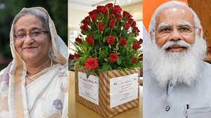 ভারতের প্রধানমন্ত্রী নরেন্দ্র মোদির ৭১তম জন্মদিন উপলক্ষে ৭১টি লাল গোলাপে আন্তরিক অভিনন্দন ও উষ্ণ শুভেচ্ছা জানিয়েছেন বাংলাদেশের প্রধানমন্ত্রী শেখ হাসিনা। শুক্রবার সকালে প্রধানমন্ত্রী শেখ হাসিনার পক্ষ থেকে গোলাপ ফুলের তোড়া