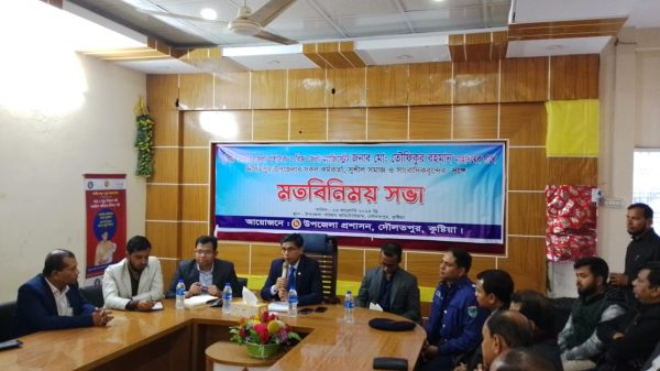 কাগজ প্রতিবেদক ॥ কুষ্টিয়ার দৌলতপুরে সরকারি কর্মকর্তা,বীর মুক্তিযোদ্ধা,শিক্ষা প্রতিষ্ঠান প্রধান,সুশীল সমাজ ও সাংবাদিকদের সাথে মতবিনিময় সভা করেছেন কুষ্টিয়া জেলা প্রশাসক ও জেলা ম্যাজিস্ট্রেট মো.তৌফিকুর রহমান। ২৩ জানুয়ারী সোমবার সকাল ১০টায়