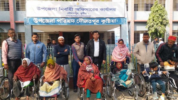 দৌলতপুর প্রতিনিধি॥ কুষ্টিয়ার দৌলতপুরে সোমবার বেলা১১টায় সমাজ সেবা অধিদপ্তরের উদ্যোগে ২২ জন অস”ছল প্রতিবন্ধী কে আনুষ্ঠানিক ভাবে হুইল চেয়ার প্রদান করেন। প্রধান অতিথি থেকে দৌলতপুর উপজেলা নিবাহী কমকর্তা মো: আব্দুল