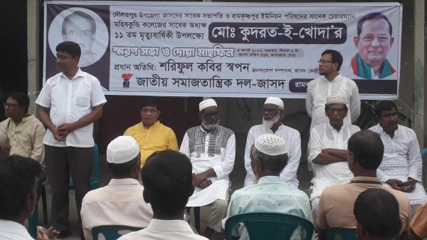 দৌলতপুর প্রতিনিধি ॥ কুষ্টিয়ার দৌলতপুরে প্রয়াত সাবেক ইউপি চেয়ারম্যান, মহিষকুন্ডি কলেজের সাবেক অধ্যক্ষ ও জাসদ নেতা কুদরত-ই-খোদার ১১তম মৃত্যুবার্ষিকী স্বরণে সভা ও দোয়া মাহফিল অনুষ্ঠিত হয়েছে। গতকাল শুক্রবার বিকেল ৫টায়
