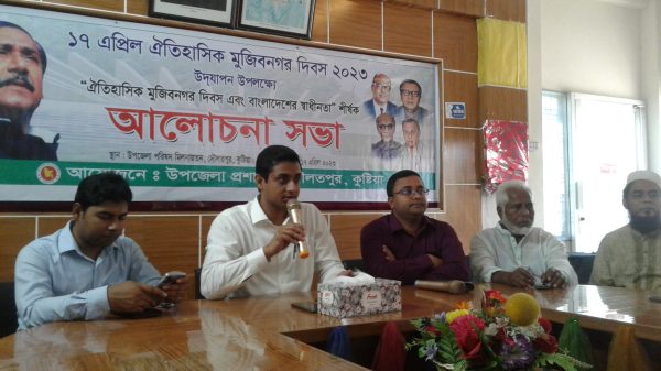 দৌলতপুর প্রতিনিধি ॥ কুষ্টিয়ার দৌলতপুরে ১৭এপ্রিল ঐতিহাসিক মুজিবনগর দিবস পালিত হয়েছে। এ উপলক্ষে গতকাল সোমবার সকাল ১০টায় দৌলতপুর উপজেলা প্রশাসনের আয়োজনে ‘ঐতিহাসিক মুজিবনগর দিবস ও বাংলাদেশের স্বাধীনতা’ শীর্ষক’ আলোচনা সভার