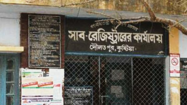 দৌলতপুর প্রতিনিধি ॥ কুষ্টিয়ার দৌলতপুর সাব-রেজিষ্ট্রার অফিসে দাখিলকরা দলিল রেজিস্ট্রেশনের জন্য দলিল লেখকরা জেলা রেজিস্ট্রার বরাবর দলিল লেখকদের গণস্বাক্ষরিত আবেদনের মাধ্যমে দাবি জানিয়েছেন। গতকাল শনিবার বেলা ১১টায় দৌলতপুর সাব-রেজিস্ট্রার কার্যালয়ের