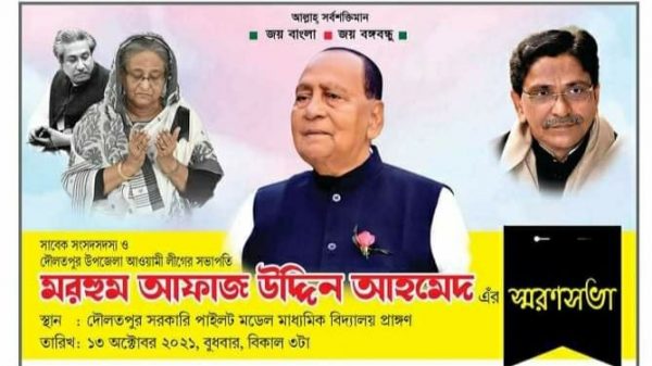 বিশেষ প্রতিবেদক ॥ ১৩ অক্টোবর বুধবার বিকালে সাবেক সংসদ সদস্য, দৌলতপুর উপজেলা আওয়ামী লীগের প্রয়াত সভাপতি আফাজ উদ্দিন আহমেদের স্মরণ সভা অনুষ্ঠিত হবে কুষ্টিয়ার দৌলতপুরে। অনুষ্ঠানে প্রধান অতিথি থাকবেন বাংলাদেশ