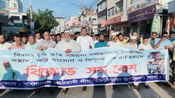 ওলি ইসলাম ॥ কুষ্টিয়ার ভেড়ামারা উপজেলা আওয়ামীলীগের উদ্যোগে গতকাল রোববার বিকেলে শহরের প্রধান প্রধান সড়কে বিএনপি ও তার সমমনা দলগুলোর নৈরাজ্য অগ্নি সংযোগ ও বিশৃঙ্খলার প্রতিবাদে বিক্ষোভ সমাবেশ ও মিছিল