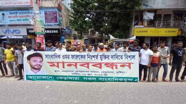 ওলি ইসলাম, ভেড়ামারা প্রতিনিধি ॥ কুষ্টিয়ার ভেড়ামারায় সোমবার বেলা ১১.০০ টার সময় সকল সাংবাদিকদের ব্যানারে সময়ের সাহসী সাংবাদিক ওমর ফারুক এর নিঃশর্ত মুক্তির দাবিতে ভেড়ামারা প্রেসক্লাব চত্বরে এক মানববন্ধন কর্মসূচি