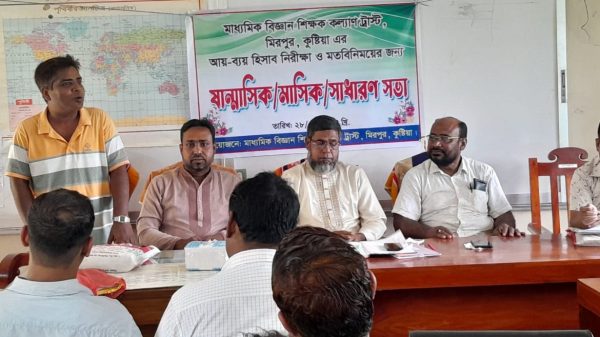 মিরপুর প্রতিনিধি ॥ কুষ্টিয়ার মিরপুরে মাধ্যমিক বিজ্ঞান শিক্ষক কল্যাণ ট্রাস্ট এর ষান্মাসিক সভা অনুষ্ঠিত হয়েছে। গতকাল শনিবার (২৮ সেপ্টেম্বর) সকাল সাড়ে এগারোটায় মিরপুর মাধ্যমিক বিজ্ঞান শিক্ষক কল্যাণ ট্রাস্ট এর আয়