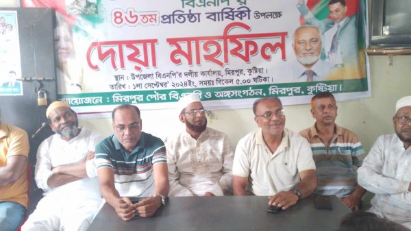এম আনোয়ার হোসেন নিশি, মিরপুর থেকে ॥ ॥ কুষ্টিয়ার মিরপুর পোড়াদহ ইউপি’র ৩ নং ওয়ার্ড বিএনপি’র আয়োজনে আলোচনা সভা ও বৈষম্য বিরোধী ছাত্র আন্দোলনের শহিদ ও আহতদের জন্য দোয়া মাহফিল