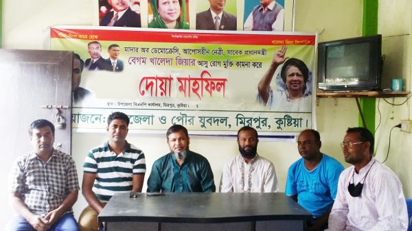 মিরপুর প্রতিনিধি ॥ বিএনপি’র চেয়ারপার্সন ও সাবেক প্রধানমন্ত্রী বেগম খালেদা জিয়ার রোগমুক্তি ও দীর্ঘায়ু কামনা করে দোয়া মাহফিল করেছে মিরপুর উপজেলা যুবদল ও পৌর যুবদল। রোববার দুপুরে উপজেলা বিএনপি’র দলীয়