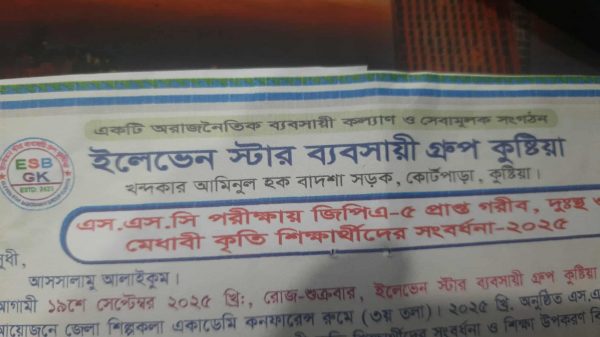 কাগজ প্রতিবেদক ॥ আজ শুক্রবার কুষ্টিয়া শহরের ব্যবসায়ীদের সংগঠন ইলেভেন স্টার ব্যবসায়ী গ্রুপের উদ্যোগে গরিব মেধাবী জিপি-৫ প্রাপ্ত শিক্ষার্থীদের মাঝে সংবর্ধনা ও শিক্ষা উপকরণ বিতরণ কর্মসুচী অনুষ্টিত হবে। জেলা শিল্পকলা