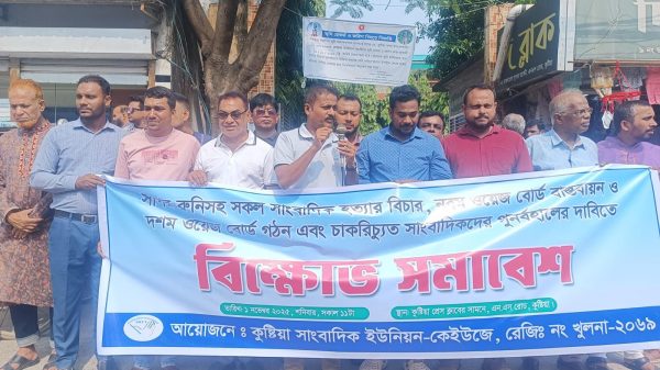কাগজ প্রতিবেদক ॥ কুষ্টিয়ায় সাংবাদিক ইউনিয়নের উদ্যোগে সাগর-রুনিসহ সকল সাংবাদিক হত্যার বিচার, নবম ওয়েজ বোর্ড বাস্তবায়ন ও দশম ওয়েজ বোর্ড গঠন এবং চাকরিচ্যূত সাংবাদিকদের পূণর্বহালের দাবিতে মানববন্ধন ও বিক্ষোভ সমাবেশ
