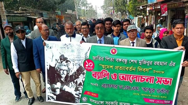 আলমডাঙ্গা ব্যুরো ॥ আলমডাঙ্গা সরকারি ডিগ্রী কলেজের উদ্যোগে জাতির পিতা বঙ্গবন্ধু শেখ মুজিবুর রহমানের স্বদেশ প্রত্যাবর্তন দিবস উপলক্ষে র্যালী ও আলোচনা সভা অনুষ্ঠিত হয়। গতকাল সকাল ১১ ঘটিকার সময় থেকে