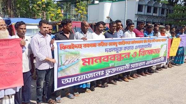 ঝিনাইদহ প্রতিনিধি ॥ ঝিনাইদহের নবগঙ্গা নদী দখলমুক্ত করার দাবীতে মানববন্ধন কর্মসূচী পালিত হয়েছে। সোমবার সকালে জেলা প্রশাসকের কার্যালয়ের এ কর্মসূচীর আয়োজন করে সদর উপজেলার জাড়গ্রামের বাসিন্দারা। কর্মসূচীতের ব্যানার ফেস্টুন নিয়ে