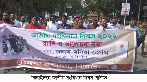 ঝিনাইদহ প্রতিনিধি ॥ ঝিনাইদহে জাতীয় সংবিধান দিবস পালিত হয়েছে। জেলা প্রশাসনের আয়োজনে শুক্রবার সকালে জেলা প্রশাসকের কার্যালয়ের সামনে থেকে একটি র্যালী বের করা হয়। র্যালীটি শহরের বিভিন্ন সড়ক ঘুরে একই