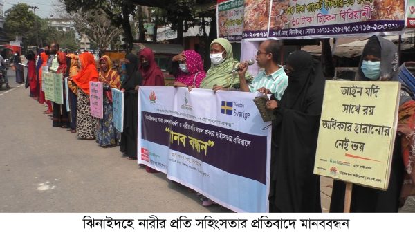 ঝিনাইদহ প্রতিনিধি ॥ ঝিনাইদহসহ দেশব্যাপী ধর্ষণ ও নারীর প্রতি সকল প্রকার সহিংসতা বন্ধের দাবিতে মানববন্ধন কর্মসূচি পালিত হয়েছে। বুধবার সকালে শহরের মডার্ন মোড় এলাকায় এ কর্মসূচীর আয়োজন করে এ্যাকশন এন