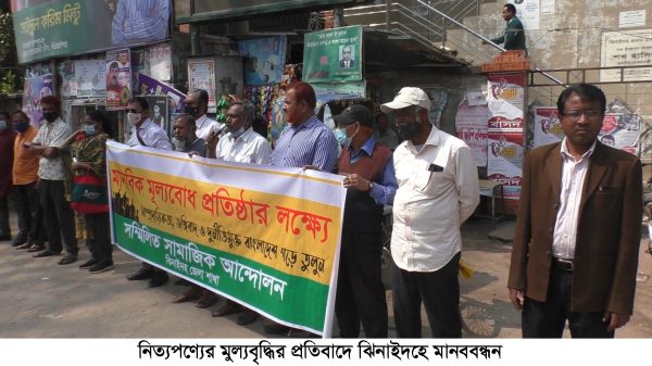 ঝিনাইদহ প্রতিনিধি ॥ গ্যাস, তেলসহ নিত্যপণ্যের মুল্যবৃদ্ধির প্রতিবাদে ঝিনাইদহে মানববন্ধন কর্মসূচী পালিত হয়েছে। মঙ্গলবার সকালে ঝিনাইদহ শহরের পোস্ট অফিস মোড়ে এ কর্মসূচীর আয়োজন করে সম্মিলিত সামাজিক আন্দোলন ঝিনাইদহ জেলা শাখা।