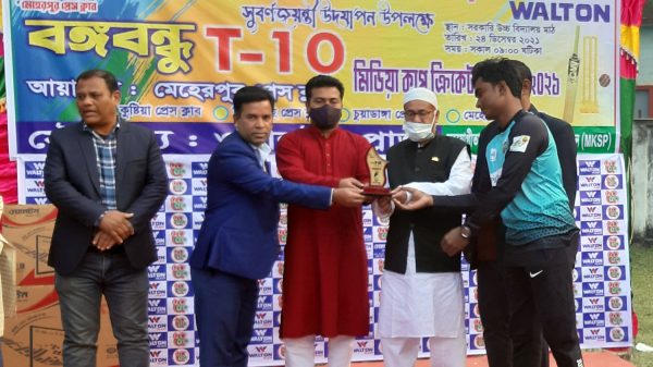 মেহেরপুর প্রতিনিধি ॥ মেহেরপুর প্রেসক্লাবের সুবর্ণ জয়ন্তী উপলক্ষে ওয়ালটন প্লাজা মেহেরপুরের সৌজন্যে মেহেরপুর সরকারি উচ্চ বিদ্যালয় মাঠে দিনব্যাপি বঙ্গবন্ধু টি-১০ মিডিয়া কাপ ক্রিকেট টুর্নামেন্ট অনুষ্ঠিত হয়েছে। এ টুর্নামেন্টে বিজয়ী হয়েছে