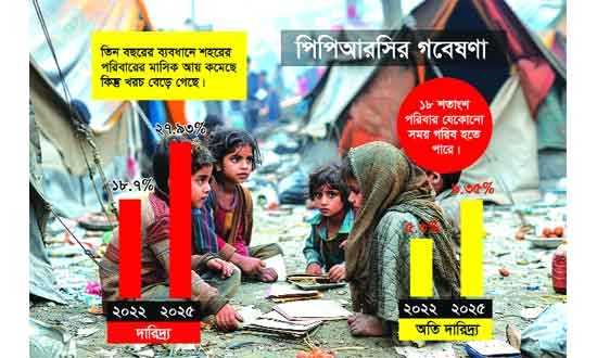 এনএনবি : তিন বছরের ব্যবধানে দারিদ্র্য কমেনি, উল্টো বেশ বেড়েছে। দেশে এখন দারিদ্র্যের হার ২৭ দশমিক ৯৩ বা প্রায় ২৮ শতাংশ। সরকারি হিসাবেই ২০২২ সালে এই হার ছিল ১৮ দশমিক